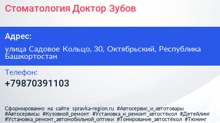 Стоматология Доктор Зубов по адресу улица Садовое Кольцо, 30, Октябрьский, Республика Башкортостан в дальнейшем Организация, размещена в следующих категориях: