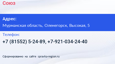 Союз по адресу Мурманская область, Оленегорск, Высокая, 5 в дальнейшем Организация, размещена в следующих категориях: