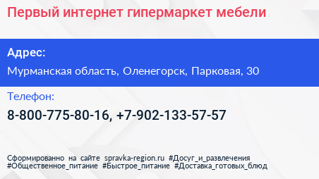 Первый интернет-гипермаркет мебели по адресу Мурманская область, Оленегорск, Парковая, 30 в дальнейшем Организация, размещена в следующих категориях: