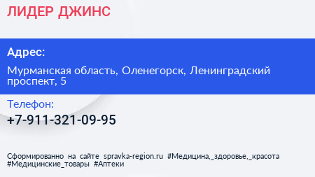 ЛИДЕР ДЖИНС по адресу Мурманская область, Оленегорск, Ленинградский проспект, 5 в дальнейшем Организация, размещена в следующих категориях: