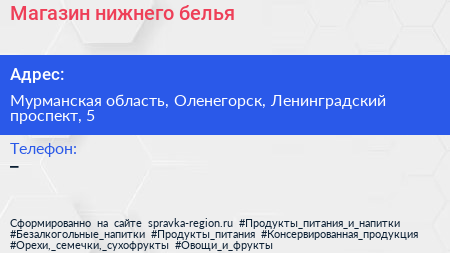 Магазин нижнего белья по адресу Мурманская область, Оленегорск, Ленинградский проспект, 5 в дальнейшем Организация, размещена в следующих категориях: