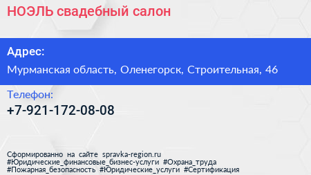 НОЭЛЬ, свадебный салон по адресу Мурманская область, Оленегорск, Строительная, 46 в дальнейшем Организация, размещена в следующих категориях: