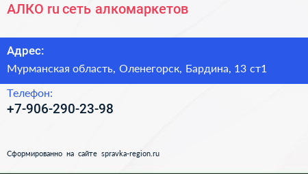 АЛКО.ru, сеть алкомаркетов по адресу Мурманская область, Оленегорск, Бардина, 13 ст1 в дальнейшем Организация, размещена в следующих категориях: