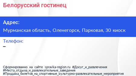 Белорусский гостинец по адресу Мурманская область, Оленегорск, Парковая, 30 киоск в дальнейшем Организация, размещена в следующих категориях: