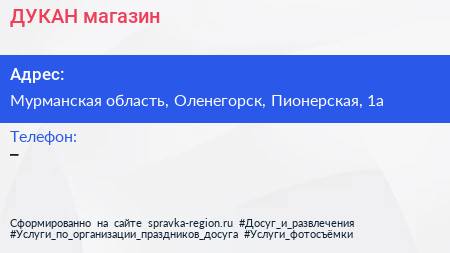 ДУКАН, магазин по адресу Мурманская область, Оленегорск, Пионерская, 1а в дальнейшем Организация, размещена в следующих категориях: