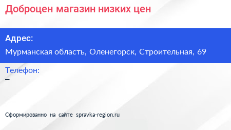 Доброцен, магазин низких цен по адресу Мурманская область, Оленегорск, Строительная, 69 в дальнейшем Организация, размещена в следующих категориях: