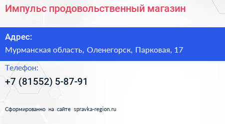 Импульс, продовольственный магазин по адресу Мурманская область, Оленегорск, Парковая, 17 в дальнейшем Организация, размещена в следующих категориях: