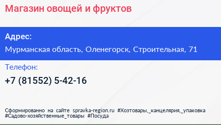 Магазин овощей и фруктов по адресу Мурманская область, Оленегорск, Строительная, 71 в дальнейшем Организация, размещена в следующих категориях: