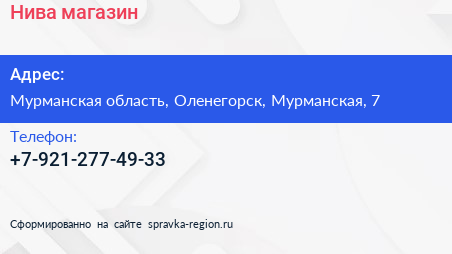 Нива, магазин по адресу Мурманская область, Оленегорск, Мурманская, 7 в дальнейшем Организация, размещена в следующих категориях: