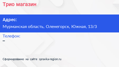 Трио, магазин по адресу Мурманская область, Оленегорск, Южная, 13/3 в дальнейшем Организация, размещена в следующих категориях: