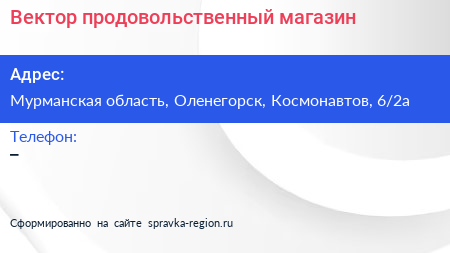 Вектор, продовольственный магазин по адресу Мурманская область, Оленегорск, Космонавтов, 6/2а в дальнейшем Организация, размещена в следующих категориях: