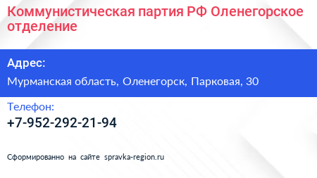 Коммунистическая партия РФ, Оленегорское отделение по адресу Мурманская область, Оленегорск, Парковая, 30 в дальнейшем Организация, размещена в следующих категориях: