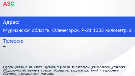 АЗС по адресу Мурманская область, Оленегорск, Р-21 1335 километр, 2 в дальнейшем Организация, размещена в следующих категориях: