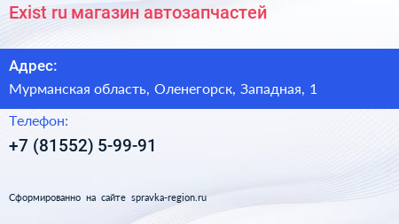 Exist.ru, магазин автозапчастей по адресу Мурманская область, Оленегорск, Западная, 1 в дальнейшем Организация, размещена в следующих категориях: