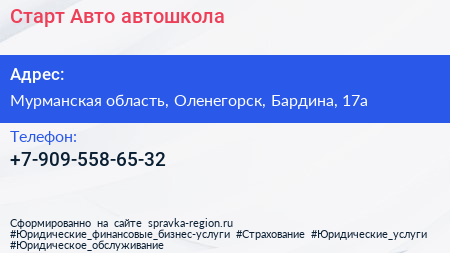 Старт-Авто, автошкола по адресу Мурманская область, Оленегорск, Бардина, 17а в дальнейшем Организация, размещена в следующих категориях: