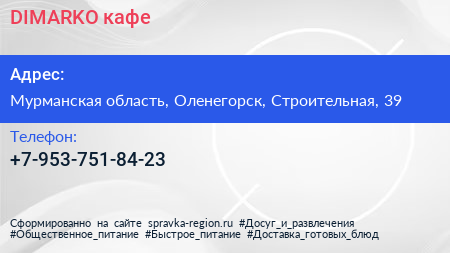 DIMARKO, кафе по адресу Мурманская область, Оленегорск, Строительная, 39 в дальнейшем Организация, размещена в следующих категориях: