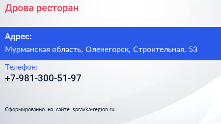 Дрова, ресторан по адресу Мурманская область, Оленегорск, Строительная, 53 в дальнейшем Организация, размещена в следующих категориях: