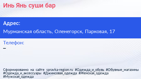 Инь Янь, суши-бар по адресу Мурманская область, Оленегорск, Парковая, 17 в дальнейшем Организация, размещена в следующих категориях: