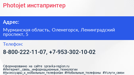 Photojet, инстапринтер по адресу Мурманская область, Оленегорск, Ленинградский проспект, 5 в дальнейшем Организация, размещена в следующих категориях: