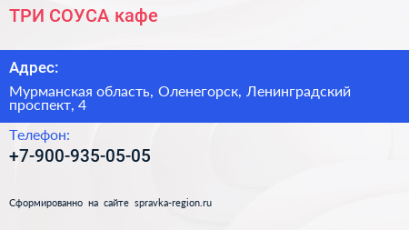 ТРИ СОУСА, кафе по адресу Мурманская область, Оленегорск, Ленинградский проспект, 4 в дальнейшем Организация, размещена в следующих категориях: