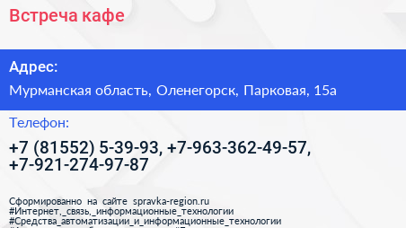 Встреча, кафе по адресу Мурманская область, Оленегорск, Парковая, 15а в дальнейшем Организация, размещена в следующих категориях: