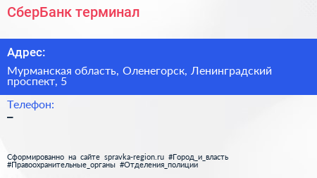 СберБанк, терминал по адресу Мурманская область, Оленегорск, Ленинградский проспект, 5 в дальнейшем Организация, размещена в следующих категориях: