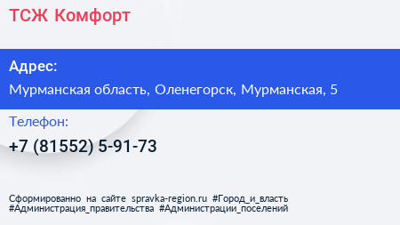 ТСЖ Комфорт по адресу Мурманская область, Оленегорск, Мурманская, 5 в дальнейшем Организация, размещена в следующих категориях: