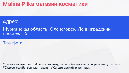Malina & Pilka, магазин косметики по адресу Мурманская область, Оленегорск, Ленинградский проспект, 5 в дальнейшем Организация, размещена в следующих категориях: