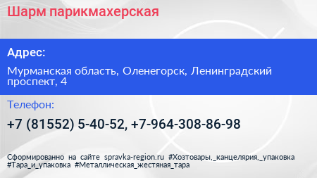 Шарм, парикмахерская по адресу Мурманская область, Оленегорск, Ленинградский проспект, 4 в дальнейшем Организация, размещена в следующих категориях: