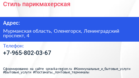 Стиль, парикмахерская по адресу Мурманская область, Оленегорск, Ленинградский проспект, 4 в дальнейшем Организация, размещена в следующих категориях:
