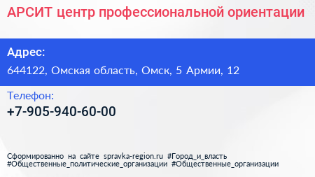 АРСИТ, центр профессиональной ориентации по адресу 644122, Омская область, Омск, 5 Армии, 12 в дальнейшем Организация, размещена в следующих категориях: