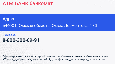 АТМ БАНК, банкомат по адресу 644001, Омская область, Омск, Лермонтова, 130 в дальнейшем Организация, размещена в следующих категориях: