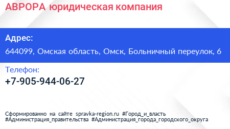 АВРОРА, юридическая компания по адресу 644099, Омская область, Омск, Больничный переулок, 6 в дальнейшем Организация, размещена в следующих категориях:
