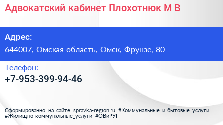 Адвокатский кабинет Плохотнюк М.В. по адресу 644007, Омская область, Омск, Фрунзе, 80 в дальнейшем Организация, размещена в следующих категориях: