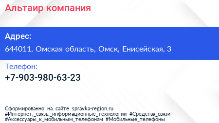 Альтаир, компания по адресу 644011, Омская область, Омск, Енисейская, 3 в дальнейшем Организация, размещена в следующих категориях: