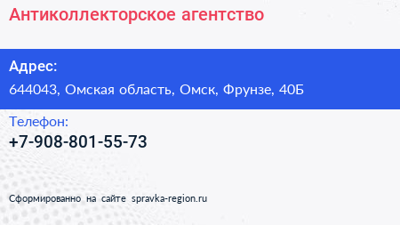 Антиколлекторское агентство по адресу 644043, Омская область, Омск, Фрунзе, 40Б в дальнейшем Организация, размещена в следующих категориях: