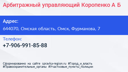 Арбитражный управляющий Коропенко А.Б. по адресу 644070, Омская область, Омск, Фурманова, 7 в дальнейшем Организация, размещена в следующих категориях: