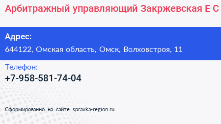 Арбитражный управляющий Закржевская Е.С. по адресу 644122, Омская область, Омск, Волховстроя, 11 в дальнейшем Организация, размещена в следующих категориях: