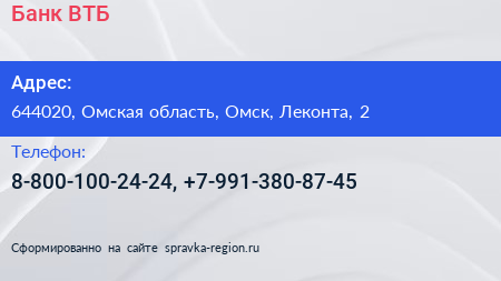 Банк ВТБ по адресу 644020, Омская область, Омск, Леконта, 2 в дальнейшем Организация, размещена в следующих категориях:
