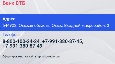 Банк ВТБ по адресу 644903, Омская область, Омск, Входной микрорайон, 3 в дальнейшем Организация, размещена в следующих категориях: