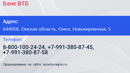 Банк ВТБ по адресу 644058, Омская область, Омск, Новокирпичная, 5 в дальнейшем Организация, размещена в следующих категориях:
