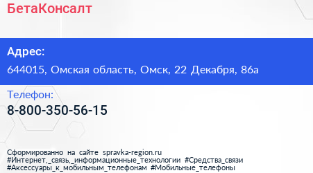 БетаКонсалт по адресу 644015, Омская область, Омск, 22 Декабря, 86а в дальнейшем Организация, размещена в следующих категориях: