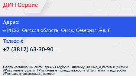 ДИП-Сервис по адресу 644122, Омская область, Омск, Северная 5-я, 8 в дальнейшем Организация, размещена в следующих категориях: