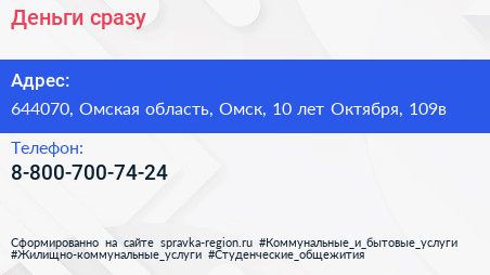 Деньги сразу по адресу 644070, Омская область, Омск, 10 лет Октября, 109в в дальнейшем Организация, размещена в следующих категориях: