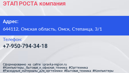 ЭТАП РОСТА, компания по адресу 644112, Омская область, Омск, Степанца, 3/1 в дальнейшем Организация, размещена в следующих категориях: