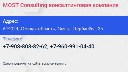 MOST-Consulting, консалтинговая компания по адресу 644024, Омская область, Омск, Щербанёва, 35 в дальнейшем Организация, размещена в следующих категориях: