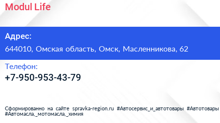 Modul Life по адресу 644010, Омская область, Омск, Масленникова, 62 в дальнейшем Организация, размещена в следующих категориях: