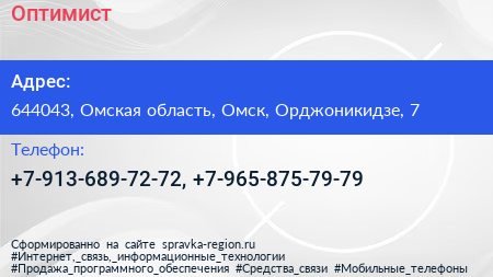 Оптимист по адресу 644043, Омская область, Омск, Орджоникидзе, 7 в дальнейшем Организация, размещена в следующих категориях: