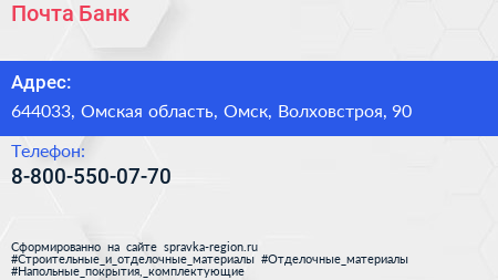 Почта Банк по адресу 644033, Омская область, Омск, Волховстроя, 90 в дальнейшем Организация, размещена в следующих категориях: