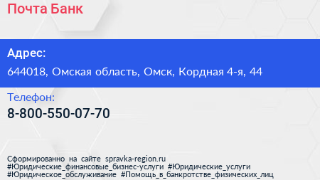 Почта Банк по адресу 644018, Омская область, Омск, Кордная 4-я, 44 в дальнейшем Организация, размещена в следующих категориях:
